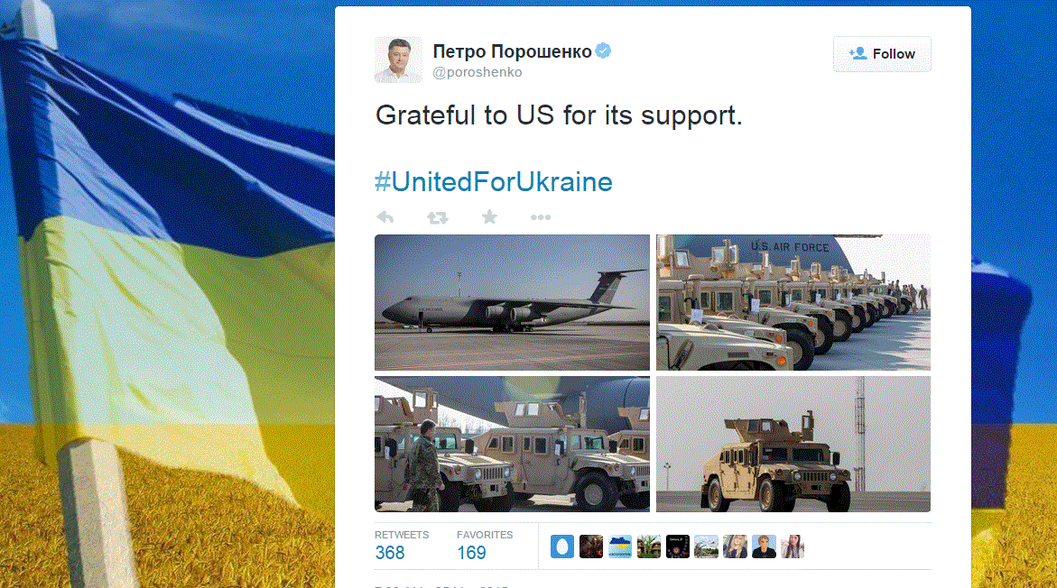 Ο Ποροσένκο στον προσωπικό του λογαριασμό στο Twitter δηλώνει σχετικά με την άφιξη αμερικανικών ορδών στη χώρα του : « Eυγνώμων στις ΗΠΑ για κάθε τους υποστήριξη».Ανεβάζει μάλιστα 4 φωτογραφίες των φημισμένων αμερικανικών ενισχύσεων που κατέφθασαν στην χώρα του. Το γεγονός ότι αναγκάζεται να δημοσιοποιήσει αυτό το μήνυμα τόσο απροκάλυπτα υποδηλώνει την δεινή θέση στην οποία περιήλθε μετά την ήττα του στρατού του στο Ντεμπάλτσεβο.CapΙΗΑΙΞΙ'ΞΞΠ