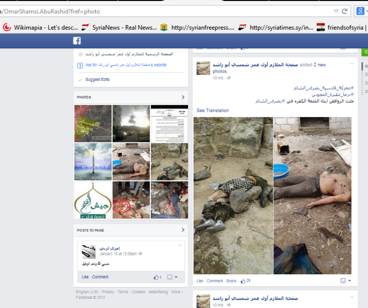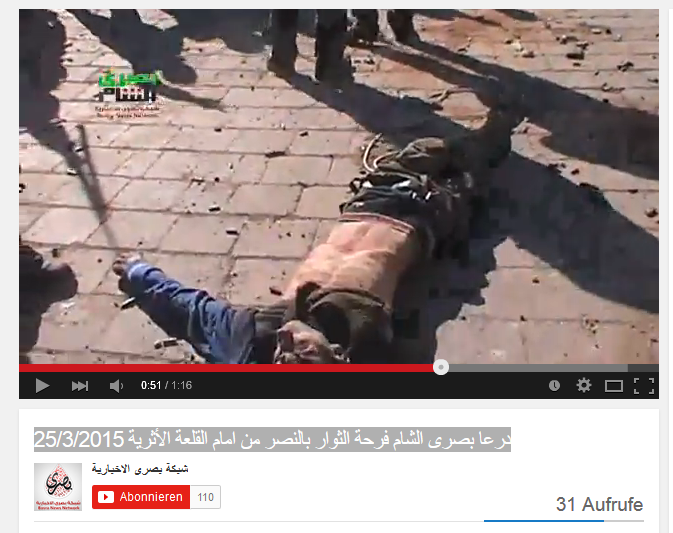 Σε μια σειρά από βίντεο και φωτογραφίες που δημοσιοποιούν φιλοαντιπολιτευτικά site εικονίζονται βασανιστήρια αιχμαλώτων σύριων στρατιωτών και πολιτών,αποκεφαλισμοί,διαπομπεύσεις σωρών.Οι σοκαριστικές εικόνες προέρχονται από την εισβολή ισλαμιστικής φράξιας τρομοκρατών στο αρχαίο ελληνιστικό αμφιθέατρο του 2ου αι.π.Χ στην πόλη Bosra της Συρίας.Σε ένα από αυτά τα βίντεο οι τρομοκράτες έχουν αιχμαλωτίσει σύριο φαντάρο. Του έχουν δέσει τα μάτια,και τον χτυπούν με το όπλο.Η λεηλασία των αρχαιολογικών θησαυρών που θα ακολουθήσει θα είναι παρόμοια με αυτήν που συνέβη και με άλλους αρχαιολογικούς χώρους σε Συρία και Ιράκ.