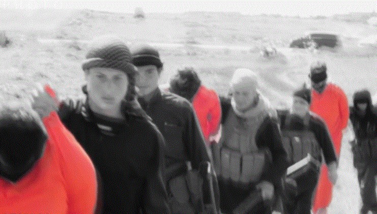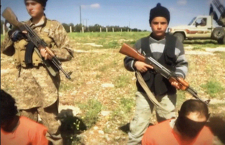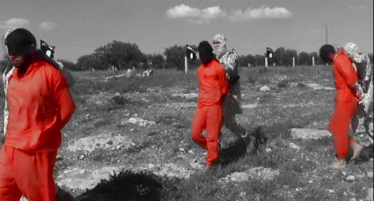Ένα βίντεο εμφανίζει εφήβους κάτω των 18 ετών να φέρουν αυτόματα και να οδηγούν 8 άνδρες ντυμένους με πορτοκαλί φόρμες σε έναν τόπο.Τους καθηλώνουν στα γόνατα στο έδαφος.Στη συνέχεια ένας από τους ανήλικους μοιράζει μαχαίρια στα μέλη της ISIS.Το βίντεο δημοσιεύθηκε σε έναν από τους λογαριασμούς της οργάνωσης στο Youtube.Η ομαδική εκτέλεση έγινε στη Χάμα.Τοποθετούν ένα λευκό πανί στον τόπο της τελετουργικής θυσίας που γίνεται κόκκινο.
