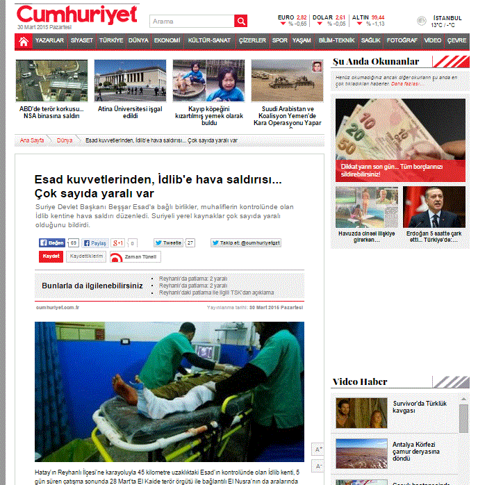 Σύμφωνα με συριακές τοπικές πηγές εβλήθησαν κατοικημένες -ακατοίκητες περιοχές που έχουν εκκενωθεί-,αστικές ζώνες ως και νοσοκομεία όπου δέχονται περίθαλψη οι εκπορθητές της πόλης. Οι τραυματίες μεταφέρονται όπως- όπως σε νοσοκομείο που έχει τεθεί υπό τον έλεγχο της λεγόμενης αντιπολίτευσης. (cumhuriyet 30/3/15 και μέσο συριακής αντιπολίτευσης)