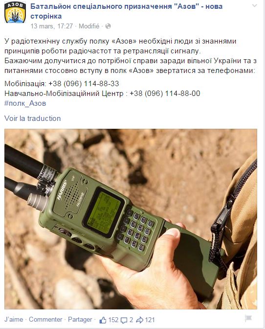 Το τάγμα της Αζοφικής έχει δημιουργήσει και σελίδα στο Facebook για την στρατολόγηση ανδρών. Περιγράφονται ως μια στρατιωτική πτέρυγα της ουκρανικής κυβέρνησης που είναι ανοιχτή σε «όλους τους ξένους εθελοντές».