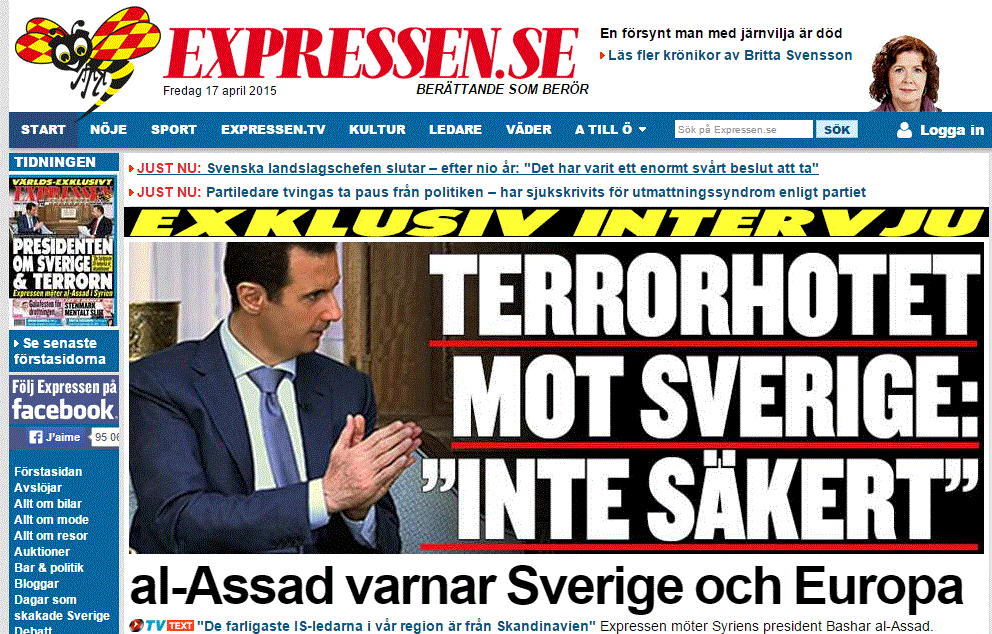 Σε αποκλειστική του συνέντευξη στον Kassem Hamade δημοσιογράφο της σουηδικής Expressen ο σύριος πρόεδρος Bachar al-Assad προειδοποιεί για την τρομοκρατική απειλή σε Σουηδία και Ευρώπη.