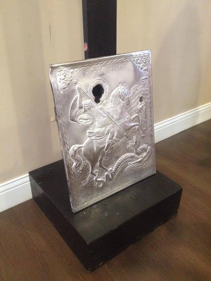 Μια άλλη εικόνα με ασημένια επένδυση του Αγ.Γεωργίου ήταν στο νάρθηκα όπου πρωτοξεκίνησε η φωτιά.Το κάδρο της καταστράφηκε αλλά η εικόνα διασώθηκε. (Myocn 16.4.15)