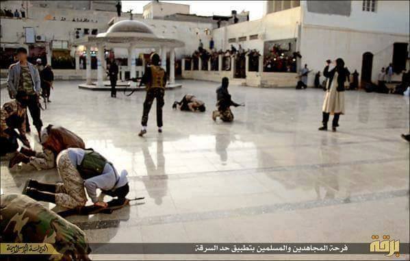 Η εφαρμογή της σαριακού τύπου τιμωρίας πραγματοποιείται στην πρωτεύουσα της Λιβύης Τρίπολη από μέλη της Daesh.Οι σκηνές διαδραματίζονται στο παλιό τζαμί.Την είδηση διακινεί λιβυκό μέσο στις 19.4.15.To θύμα προσάγεται σε έναν χώρο όπου σε κούτσουρο θα του κόψουν το χέρι.Δεν αναγράφεται η κατηγορία.Υπάρχει παρατεταγμένο απόσπασμα μασκοφόρων ενόπλων που προσδίδει επισημότητα στην τελετή αλλά και επιτηρεί.