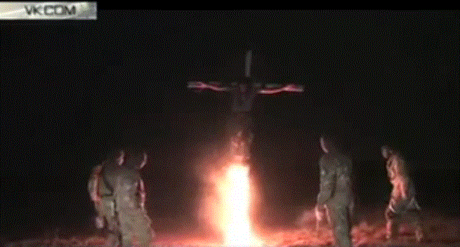 Oι ουκρανοί εθνικιστές του τάγματος “Azov” έστειλαν στην πολιτοφυλακή και στους χάκερ της “CyberBerkut” ένα βίντεο που απεικονίζει ένα τρομερό έγκλημα.Οι ναζιστές καίνε ζωντανό σταυρωμένο έναν μαχητή της Νέας Ρωσίας.