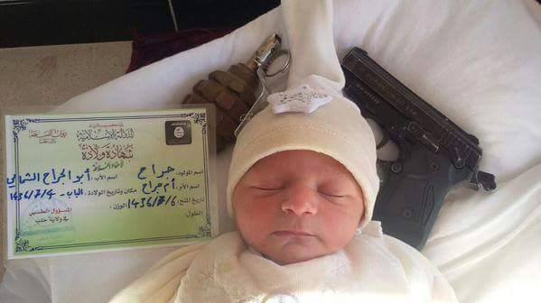 To νεογέννητο που εμφανίζεται στην φωτογραφία γεννήθηκε στις 23 Απριλίου στην περιοχή του Χαλεπίου στη Βόρεια Συρία.Διακρίνεται πιστοποιητικό γέννησης και ταυτότητα που εκδίδονται από την τρομοκρατική ισλαμιστική οργάνωση ISIS όπου αναφέρονται τα ονόματα των γονέων του. Απριλίου