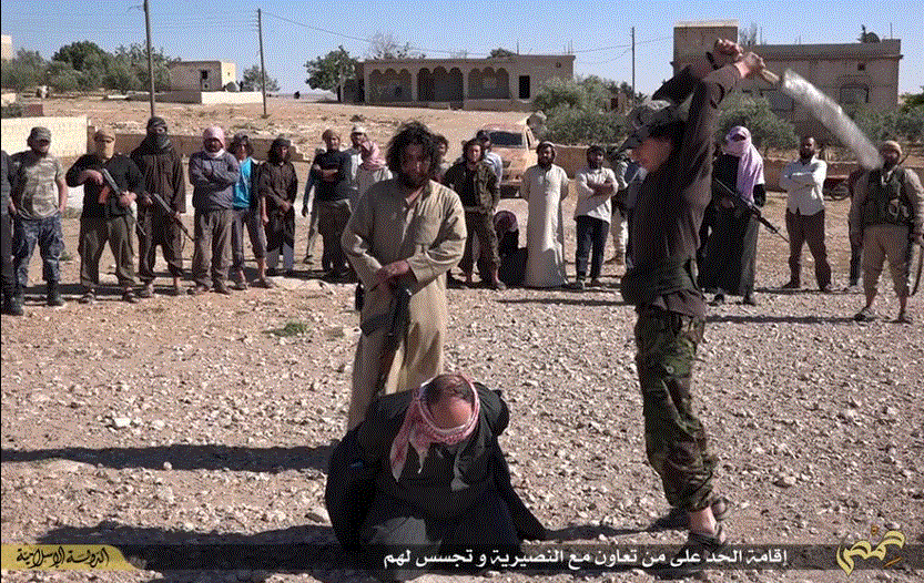 Η ΙSIS αποκεφάλισε 2 άνδρες στη Χομς της Συρίας.Τον έναν με την κατηγορία ότι είναι πληροφοριοδότης της συριακής κυβέρνησης και και τον δεύτερο για βλασφημία. Ο αποκεφαλισμός έγινε με σπάθα από δύο διαφορετικούς δήμιους.Ο ένας από τους δήμιους αποκεφαλίζει το θύμα του χωρίς να κρύβει τα χαρακτηριστικά του ενώ ο άλλος είναι μασκοφόρος.