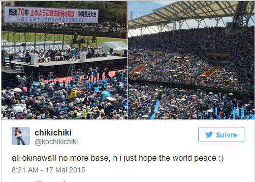 «Ακόμη και μετά την επιστροφή μας το πρόβλημα με τις στρατιωτικές βάσεις παραμένει απαράλλαχτο», δήλωσε ο Takeshi Onaga, ο κυβερνήτης της Okinawa κατά την διάρκεια της διαδήλωσης προσθέτοντας ότι η ενσωμάτωση του νησιού στην Ιαπωνία που πριν ανήκε στην Κίνα δεν επέφερε τα αναμενόμενα.«Εμείς υποφέραμε πολλά από τις βάσεις και είμαι θυμωμένος εξ αιτίας της αδιαφορίας των κυβερνήσεων των ΗΠΑ και της Ιαπαωνίας που επιμένουν για να δομήσουν μια νέα βάση στο Henoko», δήλωσε στις Japan Times ο Fujiko Matsudaεπικεφαλής των διαμαρτυρόμενων πολιτών.