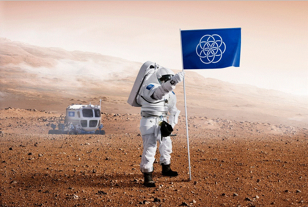 Η σημαία είναι εμπευσμένη από την οπτική των ταξιδιών στο διάστημα “προκειμένου οι αστροναύτες να αντιπροσωπεύονται περισσότερο ενωτικά παρά να προβάλουν τις χώρες τους”. (COURRIER INTERNATIONAL 19/05/2015)