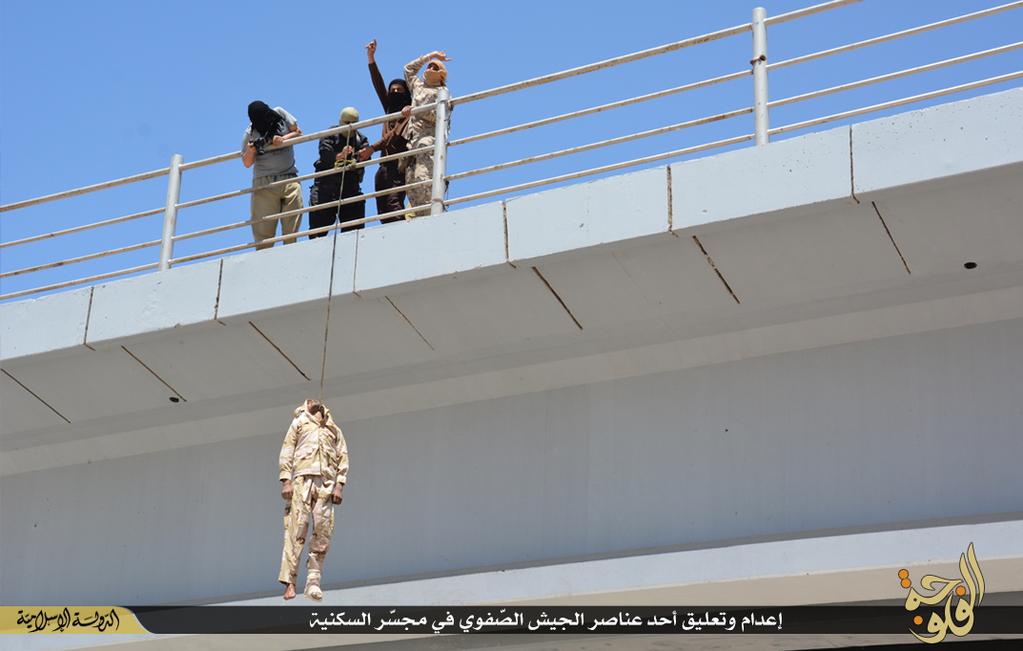 H ISIS εκτέλεσε έναν άνδρα στη Fallujah στο Ιράκ και στη συνέχεια κρέμασε τη σωρό του από γέφυρα σε δημόσια θέα για παραδειγματισμό. Η κατηγορία που του αποδόθηκε ήταν η συνεργασία του με τον ιρακινό στρατό.