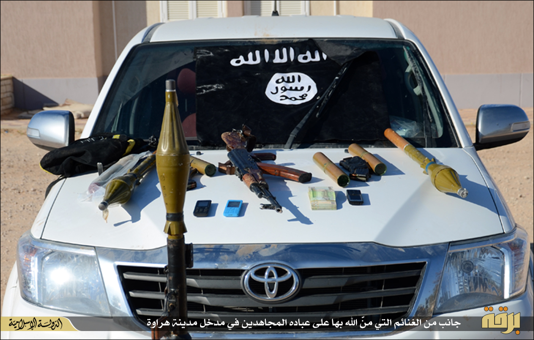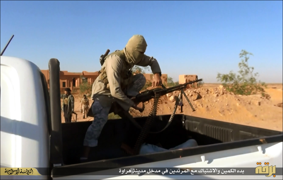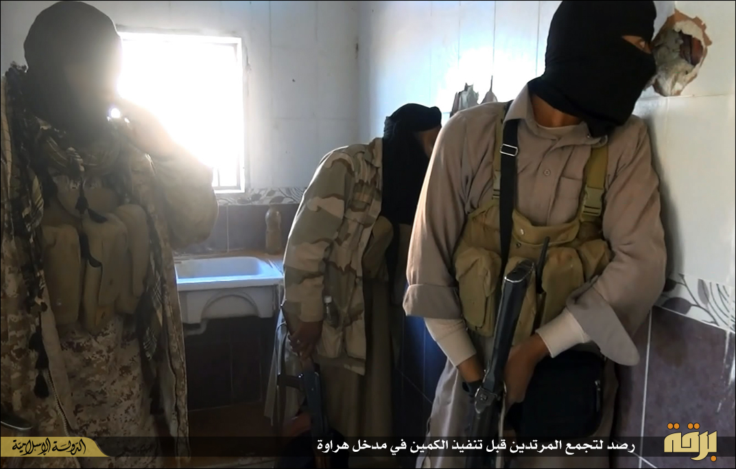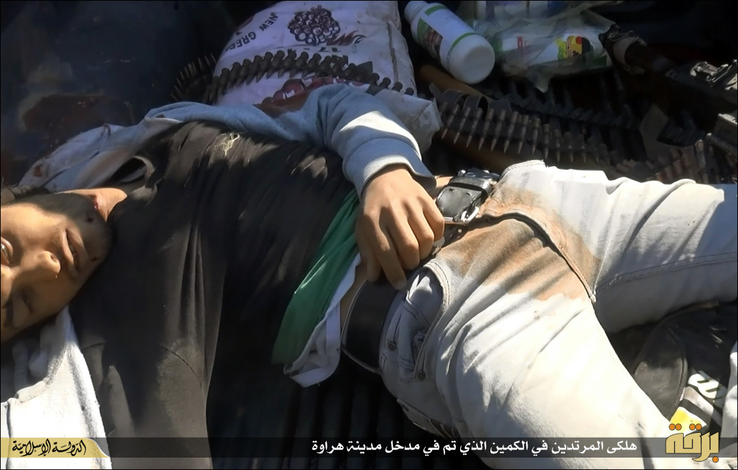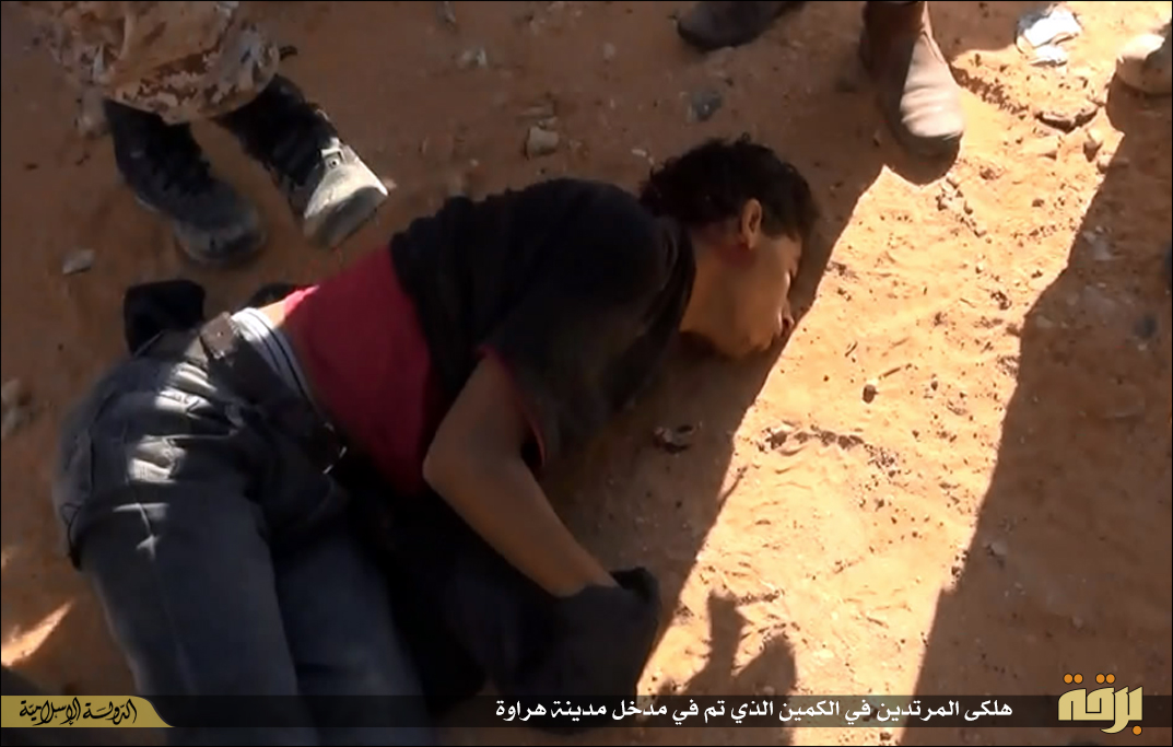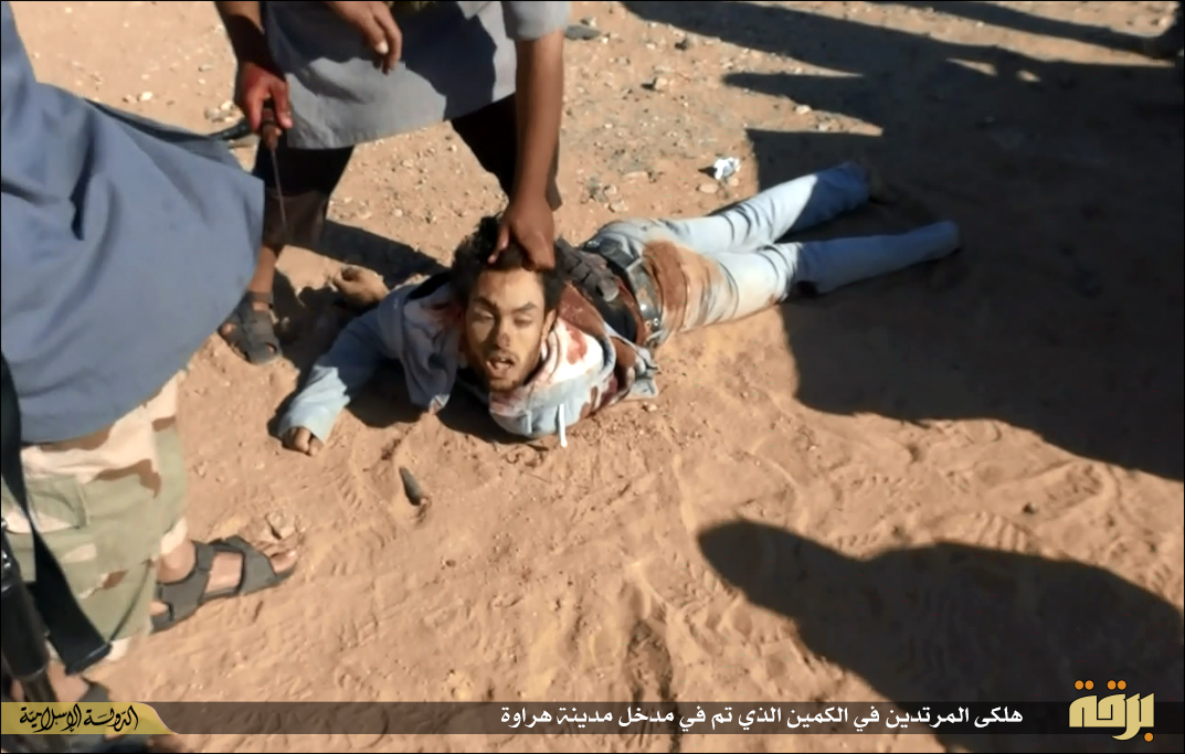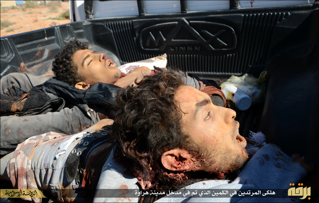 Φρικτές εικόνες δημοσιεύουν μέσα προσκείμενα στην τ οργάνωσης με αποκεφαλισμούς νεαρών ατόμων με πολιτικά από μασκοφόρους.Τα ακέφαλα σώματα και τα κομμένα κεφάλια στοιβάζονται στις καρότσες πολυτελέστατων οχημάτων ΤΟΥΟΤΑ που χρησιμοποιεί η οργάνωση κατά κόρον τόσο στη Λιβύη όσο και στο Ιράκ.Οι αποκεφαλισμοί έγιναν με μικρό μαχαίρι ακολουθώντας ουαχαμπίτικο τελετουργικό.Ημερομηνία ανάρτησής τους είναι η 19η Μάη 2015 που σύμφωνα με το ισλαμικό ημερολόγιο αντιστοιχεί στην 1η Sha’aban ( 8oς μήνας) και έτος 1436 Εγίρα.