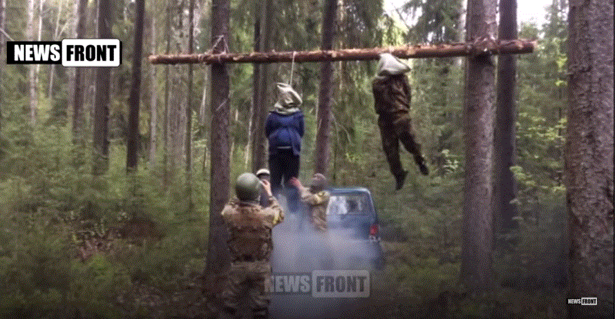 Μια από τις παραστρατιωτικές ομάδες του Ντονμπάς απαγχόνισε σε δάσος μια έγκυο γυναίκα και τον άνδρα της ένα πολιτοφύλακα νεορώσο.Στη συνέχεια άνδρες της ρωσόφωνης πολιτοφυλακής εντόπισαν τους δήμιους και κατά την καταδίωξη ο ένας από αυτούς σκοτώθηκε.To βίντεο βρέθηκε στο κινητό τηλέφωνο ενός δήμιου.