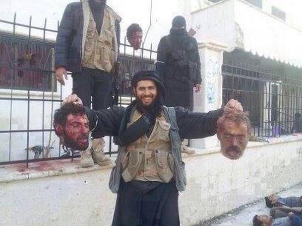 Η SIS αποκεφάλισε 2 αυτοαποκαλούμενους σύριους αντάρτες στην Al-Bab στο Χαλέπι.Διαφορές ενδοπαραταξιακές.Η φωτογραφία δείχνει μέλος της να κρατάει τα 2 κεφάλια ενώ πιο εκεί κοίτονται σειρά οι εκτελεσμένοι.