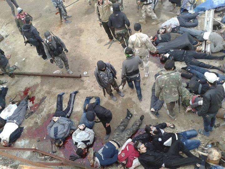 Στο μεταξύ διάχυτη είναι η αίσθηση ότι τα εγκλήματα που συμβαίνουν σε αυτόν τον ολοκληρωτικό και ανορθόδοξο βρώμικο πόλεμο από την πλευρά των ισλαμιστών σπάνια βλέπουν το φως της δημοσιότητας.Εκτεταμένες σφαγές και ομαδικές εκτελέσεις στην ιστορική Παλμύρα εκατοντάδων ατόμων και όμως ελάχιστο υλικό δημοσιοποιήθηκε.Η γενοκτονία του συριακού λαού από ξένους πάνοπλους μουτζαχεντίν που εισέβαλαν κατά χιλιάδες από Τουρκία και Ιορδανία συνεχίζεται.Με ημερομηνία ανάρτησης 26 Μαίου διακινήθηκε φωτογραφία από ομαδική σφαγή ανδρών πολιτώγ.Σε λίμνη αίματος σε δρόμο πόλης κοίτονται τουλάχιστον 20 σφαγμένα πτώματα.Κάποιοι είναι αποκεφαλισμένοι ενώ άλλοι σφαγιασμένοι ενώ έχουν και δεμένα πισθάγκωνα τα χέρια.Το πιθανότερο και αυτή η φωτογραφία να προέρχεται από την Παλμύρα όπως και προηγούμενες που διέρρευσαν.