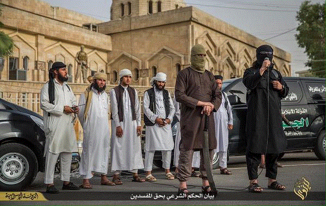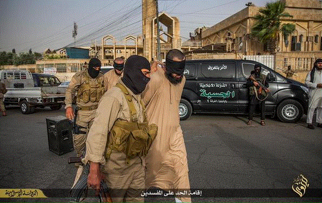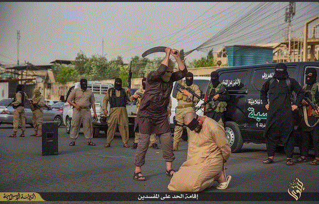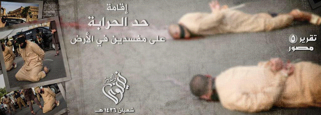 Kαι νέο έγκλημα των ισλαμιστών.Πριν από λίγες ώρες δημοσιοποιήθηκε στα μέσα κοινωνικής δικτύωσης που πρόσκεινται στην ISIS δημόσια εκτέλεση.Εκτέλεσαν δημόσια και με αποκεφαλισμό 2 άνδρες.Προηγήθηκε η ανακοίνωση της θανατικής ποινής του σαριακού δικαστηρίου.Ο κουκουλοφόρος δήμιος χρησιμοποίησε σπάθα.
