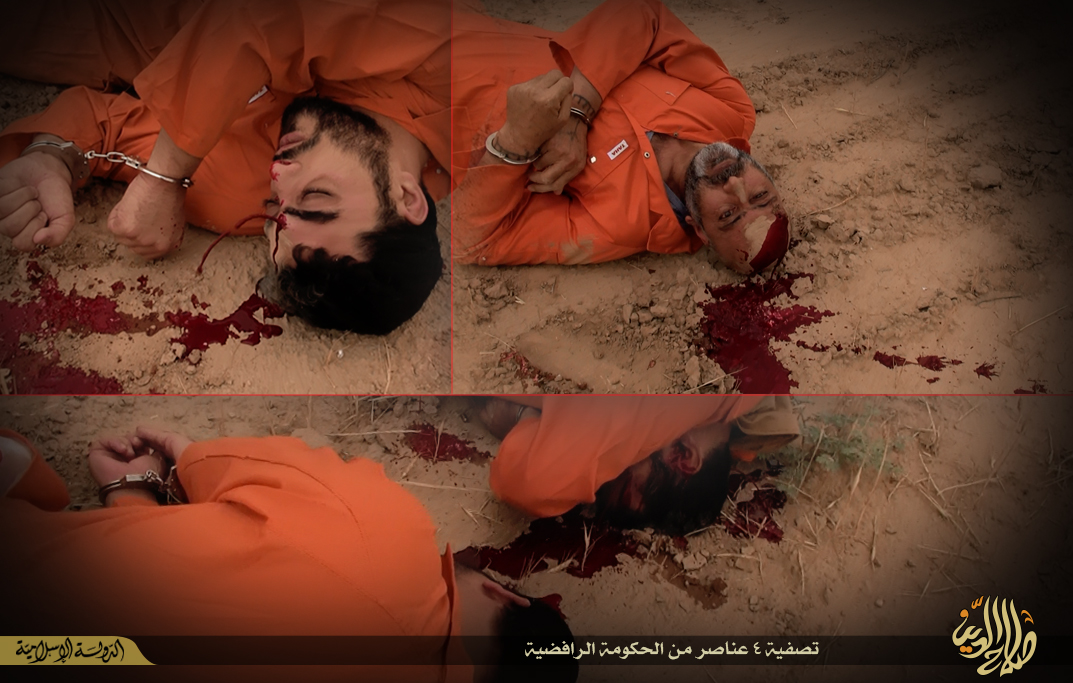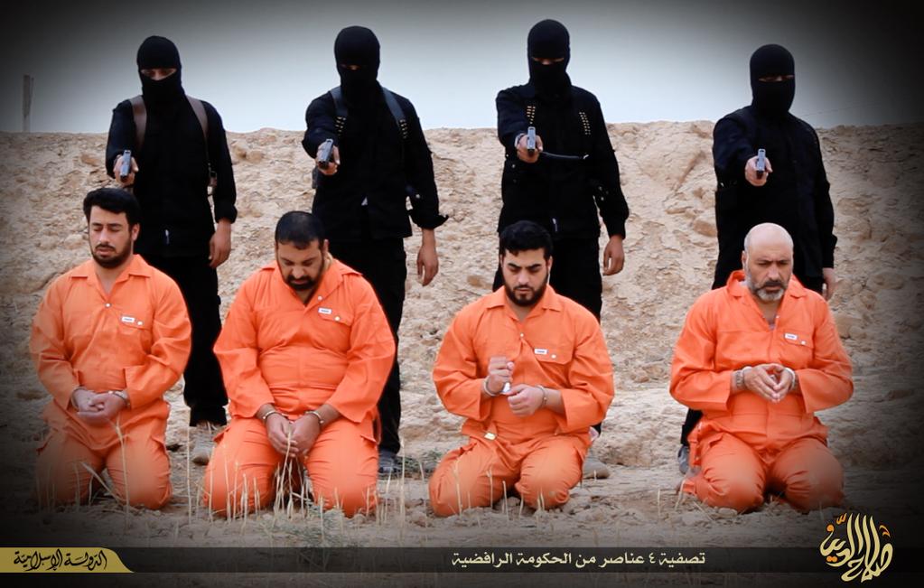 Ένα εκτελεστικό απόσπασμα της ISIS εκτελεί σε ύπαιθρο 4 άτομα στο Ιράκ.Η κατηγορία που τους αποδίδεται είναι ότι είναι πράκτορες της ιρακινής κυβέρνησης.Τους εκτελούν με πιστόλια.