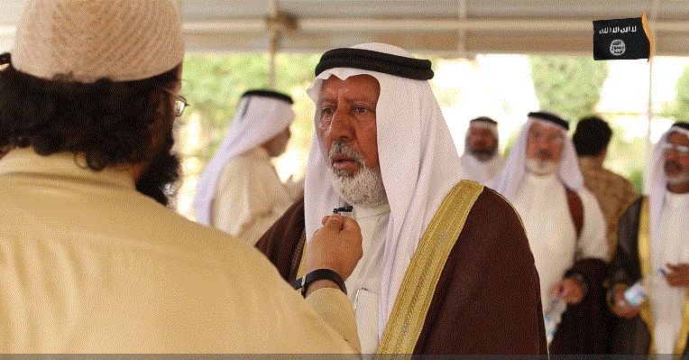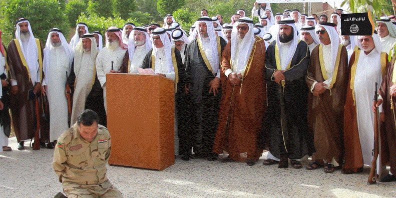Oι φυλές της Anbar ορκίστηκαν υποταγή στην Daesh στη Falloujah του Ιράκ.Συναθροίσθηκαν οι σείχηδες και γιόρτασαν το γεγονός με μια δημόσια εκτέλεση ιρακινού στρατιωτικού.Τον πυροβόλισαν εξ επαφής στο κεφάλι.Οι δήμιοι είναι κουκουλοφόροι και φέρουν στο πέτο το logo της οργάνωσης του Ισλαμικού Κράτους.