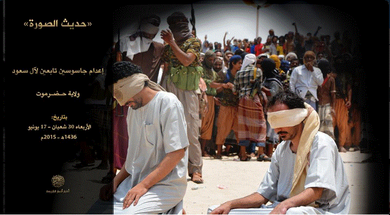 - Στην Υεμένη η Αλ Κάιντα Υεμένης AQAP δημοσιοποίησε φωτογραφία που απεικονίζει αιχμαλώτους και σε θέση για εκτέλεση 2 σαουδάραβες που κατηγορούνται για κατασκοπεία.Αλλά δεν δημοσιοποιήσε την στιγμή της δολοφονίας