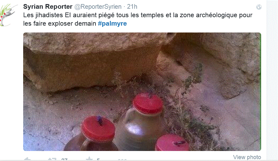 Αξισοσημείωτο είναι το γεγονός ότι μέσο της συριακής ψευδεπίγραφης αντιπολίτευσης με τα 3 *** αστέρια έδινε πρώτο την πληροφορία εδώ και 21 ώρες κάτι που πιστοποιεί τη διασύνδεση της “αντιπολίτευσης” με την ISIS.To Syrian Reporter όπως επιγράφεται αναφέρει από χθες ότι οι τζιχαντιστές της ISIS παγίδευσαν όλους τους ναούς και τον αρχαιολογικό χώρο για να τους αντινάξουν αύριο δηλ. σήμερα.