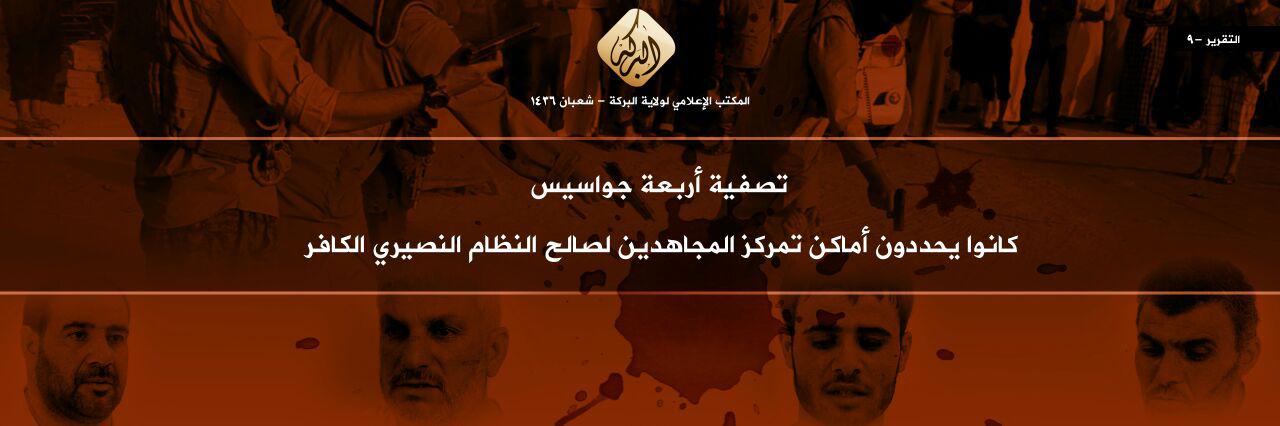 H Daech εκτέλεσε 4 πολίτες στην Deirezzor.Το μήνυμα που εκδίδει το τοπικό Γραφείο Πληροφοριών της Οργάνωσης κάνει λόγω για απίστους Alnasiri δηλ. αλαουίτες ή υποστηρικτές της κυβέρνησης των αλαουιτών.Η κατηγορία που τους αποδίδεται είναι κατασκοπεία και ότι τα αάτομα αυτά είχαν κάνει διείσδυση στις γραμμές της.Τα θύματα φέρουν πορτοκαλί ενδυμασία και οι δήμιοι μετέχουν σε εκτελεστικό απόσπασμα που τους εκτελεί δια συγχρονισμένων πυροβολισμών.