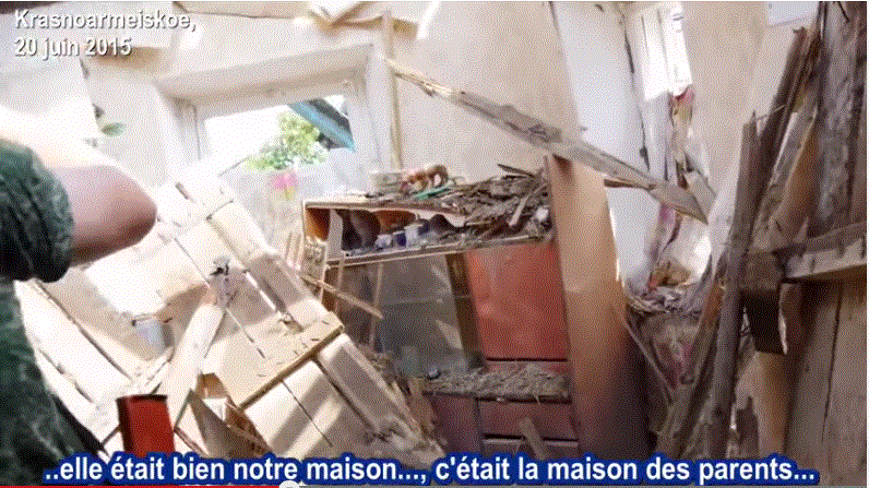 Οι επιθεωρητές του OSCE επισκέπτονται την πληγείσα περιοχή.Η κάτοικος του σπιτιού τους υπενθυμ΄ζιει ότι θα πρέπει να καταγράψουν την παραγματικότητα γιατί η η τηλεόραση της Μαριούπολης που την κατέχουν οι Ουκρανοί μεταφέρει διαφορετικά τα γεγονότα και δεν αναταποκρίνεται στην αλήθεια.Λέει ό τι οβίδες προέρχονται από άλλη πλευρά για να καλύψει την ενοχή των ουκρανικών δυνάμεων. « Τα πυρά προήλθαν από μια κατεύθυνση 240 με 250 προήλθαν από δυτικά ,νοτιοδυτικά δηλ. ακριβώς από την πλευρά της Μαριούπολης. Και αυτό ακριβώς θα μεταφέρουμε στην έκθεσή μας » αναφέρουν οι άνθρωποι του OSCE.