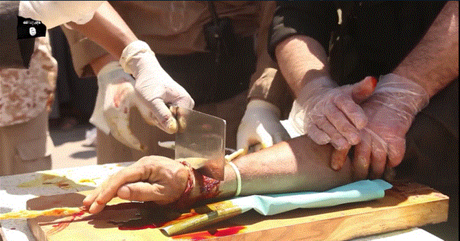 Σφαγείο …..στη Χομς……..μέλη της ISIS ακρωτηριάζουν κόβουν χέρια και πόδια από έναν δυστυχή πολίτη.Είναι ο μεσαίωνας του ισλαμισμού.Η κατηγορία που του αποδόθηκε είναι η ένοπλη ληστεία.