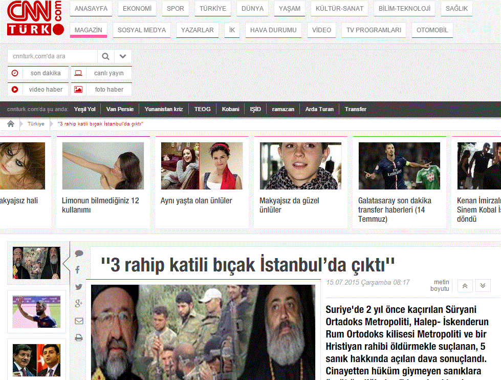 Δικαστήριο της Τουρκίας επέβαλε 7,5 χρόνια φυλακή σε 2 τσετσένους εκ των οποίων ο Magomed Abdurakmanov που Συρία πριν από δύο χρόνια απήγαγαν τους επισκόπους Χαλεπίου τον συρορθόδοξο Ιωάννη Αβραάμ και τον Παύλο Γιαζίζι.Οι τσετσένοι κατηγορήθηκαν ότι αποκεφάλισαν χριστιανό ιερωμένο αν και τελικά καταδικάστηκαν μόνο για τη συμμετοχή τους σε τρομοκρατική οργάνωση.Eνώ είχε εντοπιστεί σε σπίτι στην Κωνσταντινούπολη και το μαχαίρι του σφαγιασμού του βίντεο.