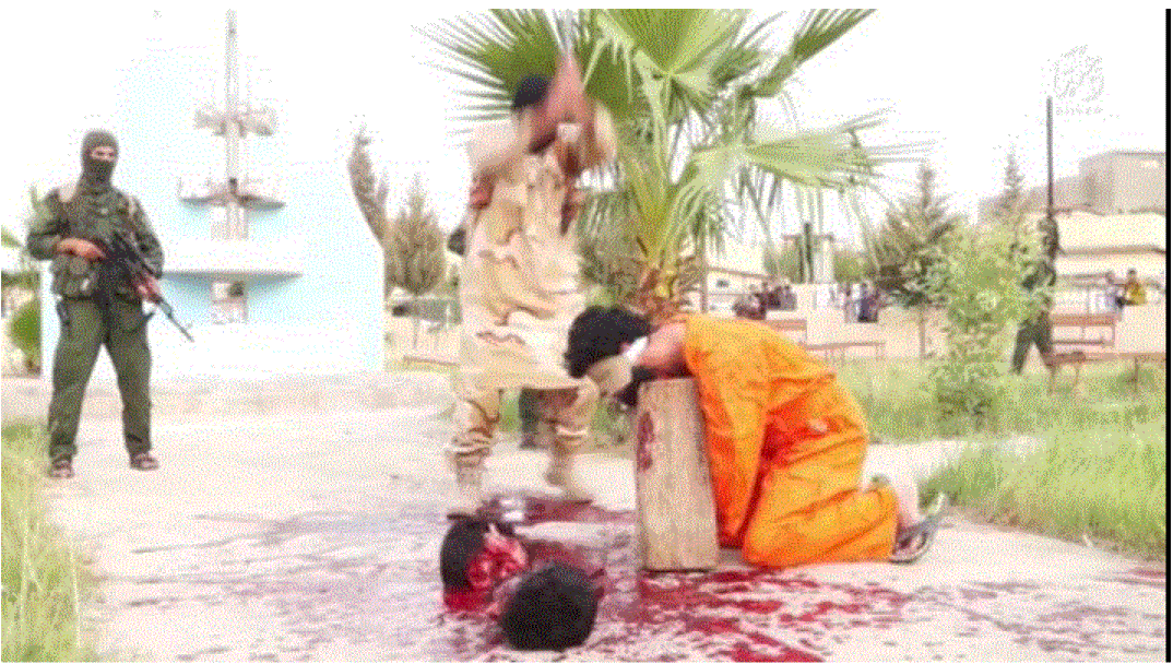 Τα θύματα έχουν υποχρεωθεί να θέσουν το κεφάλι επί κούστουρου για να διευκολύνουν τον θηριώδη μασκοφόρο δήμιο.Δεν ανακοινώνεται ο ακριβής τόπος της τελετουργικής ουαχαμπίτικης ανθρωποθυσίας.Πιθανότατα να είναι το Ιράκ.