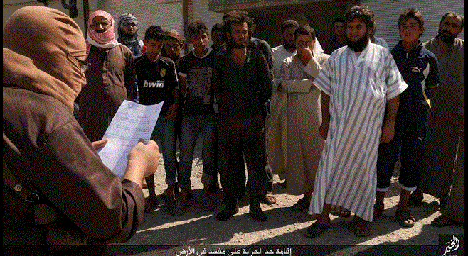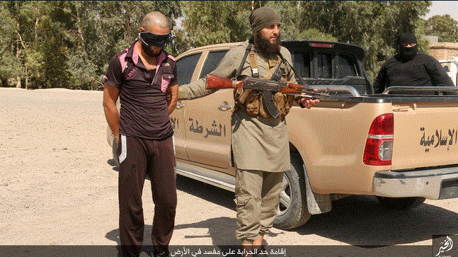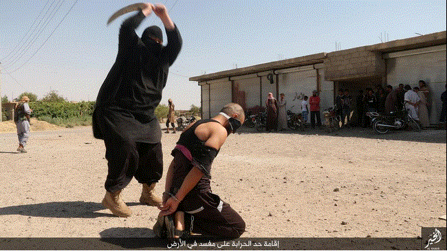 Στις 27 Ιουλίου στην περιοχή της Deir Ezzor στη Συρία η ISIS αποκεφάλισε έναν άνδρα με την κατηγορία της ένοπλης ληστείας. H εκτέλεση ήταν δημόσια και χρησιμοποιήθηκε σπάθα από το δήμιο.Το θύμα στα γόνατα με μπαναταρισμένα τα μάτια και ο δήμιος ως γνωστόν κουκουλοφόρος.Προηγήθηκε σαριακού τύπου δικαστήριο.