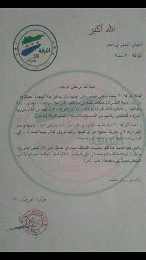 Tην ίδια στιγμή η μονάδα 30 της ένοπλης πτέρυγας της αμερικανοτραφείσας χρηματοδοτούμενης από το Κογκρέσο των ΗΠΑ FSA με ανακοίνωση της διαψεύδει τις όποιες σχέσεις της με τις ΗΠΑ και δηλώνει ότι πολεμάει μόνο Assad και ISIS.