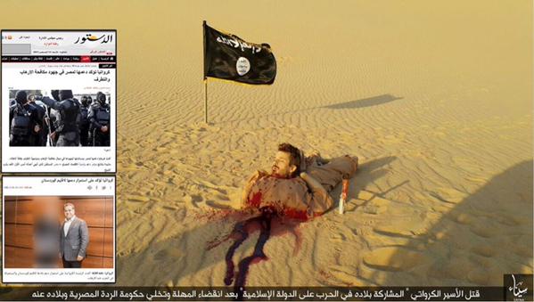 update Tην επίμαχη φωτογραφία του αποκεφαλισμού συνοδεύει λεζάντα με το εξής μήνυμα:”δολοφονία του κροάτη ομήρου εξ αιτίας της συμμετοχής της χώρας του στον πόλεμο κατά του ισλαμικού κράτους μετά την εκπνοή του τελεσίγραφου …”.Αν επιβεβαιωθεί θα είναι ο πρώτος γνωστός αποκεφαλισμός δυτικού από την οργάνωση Επαρχία του Σινά την μετονομασθείσα Ansar Bayt al-Maqdis.(Reuters)