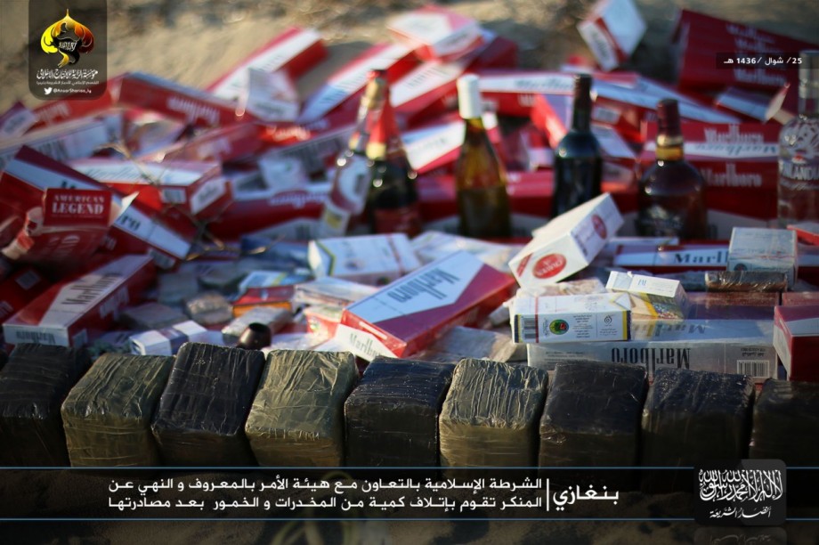 Η ανακοίνωση του παραρτήματος της ισλαμιστικής οργάνωσης στη Βεγγάζη αναφέρει ότι « η ισλαμιστική αστυνομία σε συνεργασία με την Επιτροπή για την προώθηση της Αρετής και την Πρόληψη κατέστρεψαν ποσότητα ναρκωτικών και αλκοόλ που κατασχέθηκε .»