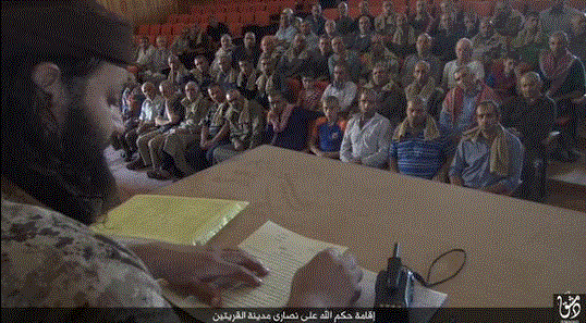 H τρομοκρατική ISIS που έχει αφεθεί ανεξέλεγκτη σαν τυφώνας στη Μέση Ανατολή επιβάλει τώρα Jizyah κεφαλικό φόρο στους Dhimmi όπως λέγονται οι χριστιανοί που ζουν επί μουσουλμανικών εδαφών και πιο συγκεκριμένα στην πόλη al-Qaryatain ΝΑ της Homs.Την πόλη αυτή κατέλαβε πρόσφατα και μάλιστα απήγαγε περισσότερους από 200 κατοίκους κατά πλειοψηφίαν χριστιανούς.