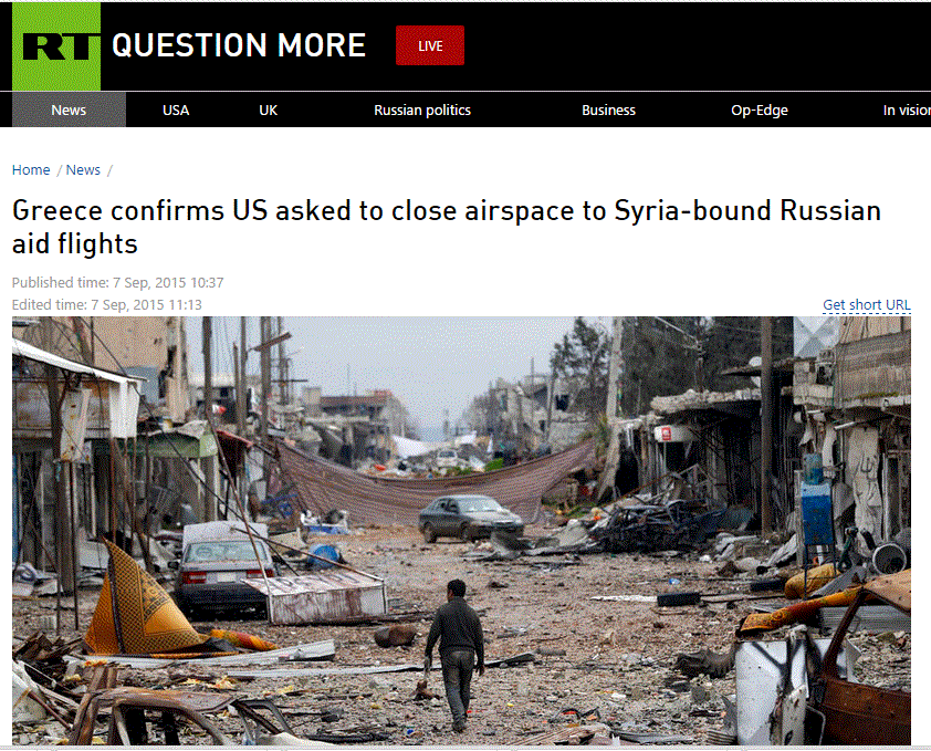 Η πηγή που επικαλείται το RIA πρόσθεσε ότι η Ρωσία είχε ζητήσει να χρησιμοποιήσει τον ελληνικού εναέριο χώρο για ανθρωπιστικούς πτήσεις προς τη Συρία από 1 έως 24 Σεπ.(rt 7/9/15)
