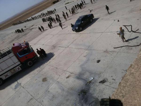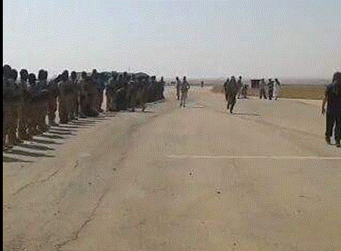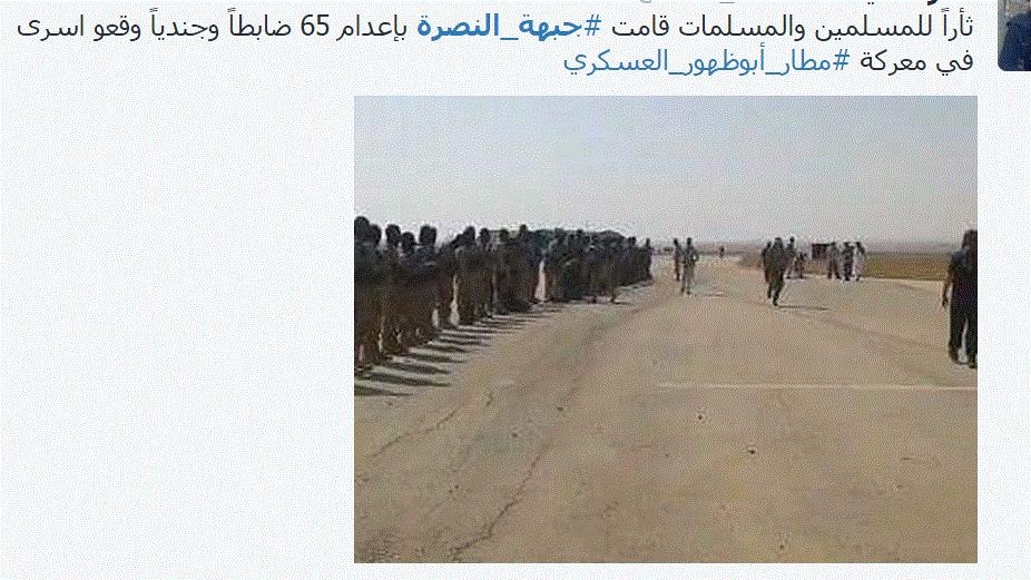 Oμαδική εκτέλεση δεκάδων σύριων στρατιωτών στην πίστα του στρατιωτικού αεροδρομίου Abu al-Duhur στην περιφέρεια του Ιντλίμπ από την τρομοκρατική οργάνωση Jabhat al Nusra.Oι σουνίτες εξτρεμιστές παρακλάδι της αλ Κάιντα στη Συρία κατέλαβαν το αεροδρόμιο στις 9 Σεπτέμβρη μετά από πολιορκία 2 χρόνων.Νωρίτερα είχαν δημοσιοποιήσει φωτογραφίες και βίντεο με αιχμαλώτους στρατιώτες και σήμερα διαρρέουν στα μέσα τους τις φωτογραφίες της ομαδικής εκτέλεσης στους διαδρόμους του αεροδρομίου.Πρόκειται για κλασικού τύπου ομαδική εκτλεση τους έχουν παρατάξει σε σειρά και τους εκτελούν με όπλα.Μήνυμα στο twitter λογαριασμού που πρόσκειται στους ισλαμιστές αναφέρει ότι εκτελέστηκαν ως αντίποινα 56 στρατιώτες και αξιωματικοί.
