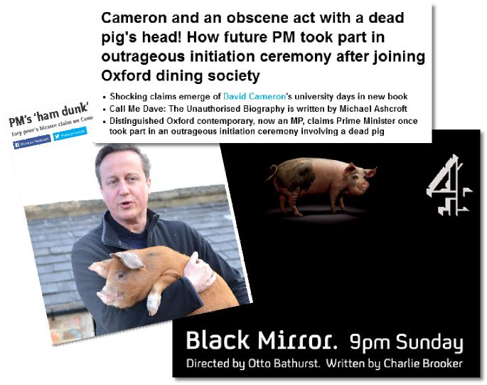 Ο Ντέιβιντ Κάμερον αντιμετωπίζει τώρα ένα τεράστιο σκάνδαλο που έχει ξεσπάσει μετά από την έκδοση του βιβλίου Call Me Dave του Λόρδου Ashcroft που ισχυρίζεται ότι ο είχε σαρκική επαφή ο Πρωθυπουργός της Αγγλίας έκανε μια σεξουαλική πράξη με ένα νεκρό γουρούνι.Ο αείμνηστος Count Gottfried von Bismarck , σύγχρονος του Κάμερον στην Οξφόρδη, είχε αναφέρει ότι γίνονταν ”δείπνα των χοίρων”.