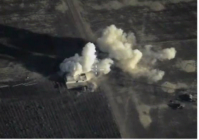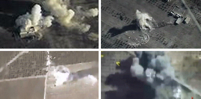 “Σε περιοχή του Idlib, αναγνωρστικό αεροσκάφος ταυτοποίησε αντιαεροπορικό σύστημα το οποίο και εξουδετερώθηκε από ρωσικά βομβαρδιστικά “.Aεροσκάφη Su-24M έδρασαν στην περιφέρεια της Λαττάκεια.Με Βόμβες KAB-500 χτύπησαν το κρυσφύγετο ανώτερων στελεχών στη Salma το οποίο και καταστράφηκε ολοκληρωτικά.Ομοίως καταστράφηκαν 5 οχήματα κοντά στο ίδιο σημείο.Πάντα στην ίδια περιφέρεια της Λαττάκεια βομβαρδιστικά Su-24M κατέστρεψαν 6 αυτοκίνητα επανδρωμένα με οπλικά συστήματα. Στην περιχοή της Hama τα Su-25SM έπληξαν θέσεις των τρομοκρατών κατέστρεψαν αποθήκες πυρομαχικών και λογισμικό.Σε συνοικία της Herbet-αl-Arus, στην επαρχία του Idlib καταστράφηκε σε ορεινή περιοχή στρατόπεδο εκπαίδευσης.RT 11/10/15
