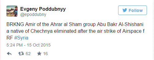 Η επιχείρηση πραγματοποιήθηκε στις 14 Οκτώβρη και τα ρωσικά μαχητικά έπληξαν στην περιχοή της Homs την τρομοκρατική οργάνωση “Ahrar al-Sham” σκοτώνοντας μέλη της και τον περιβόητο εμίρη τσετσενικής καταγωγής Abou Bakr al-Shishani που φέρεται να είναι ο αρχηγός της..