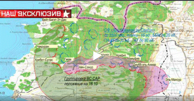 Πηγή του ρωσικού Υπ.Άμυνας διοχέτευσε στο tvzveda 19.10.15 χάρτη με την ολομέτωπη επίθεση του συριακού στρατού κατά της ISIS.Είναι μια επίθεση μεγάλης κλίμακας και προς κάθε κατεύθυνση που άρχισε ο στρατός στις 7 Οκτώβρη και πραγματοποιείται με την υποστήριξη τηλεδιάσκεψης με τη ρωσική αεροπορία. Στη Β Λαττάκεια ο στρατός ελευθέρωσε Ayn Samur, Jubb al Ahmar, Al-Mansur, κα μάχεται για τη Salma,Gmama, Salma και Mamufii Arafita.