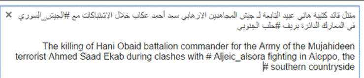 UPDATE/Μονάδες του συριακού στρατού μαζί με τις Μονάδες Εθνικής Άμυνας απελευθέρωσαν την Sabiqiya ΝΔ του Χαλεπίου.Στην περιφέρεια του Χαλεπίου τα μέσα κοινωνικής δικτύωσης αναγνώρισαν 3 αρχηγούς των τζιχαντιστών που σκοτώθηκαν.Είναι ο στρατιωτικός επικεφαλής του Στρατού των Moujahidine ο Saad Ahmad Εkkab, το μέλος του συμβουλίου της ψευδεπίγραφης επαρχίας Ελεύθερο Χαλέπι ο Ahmad Kharfane και ο εμίρης της αλ Nusra στη Zarba ο Khaled Atawi.