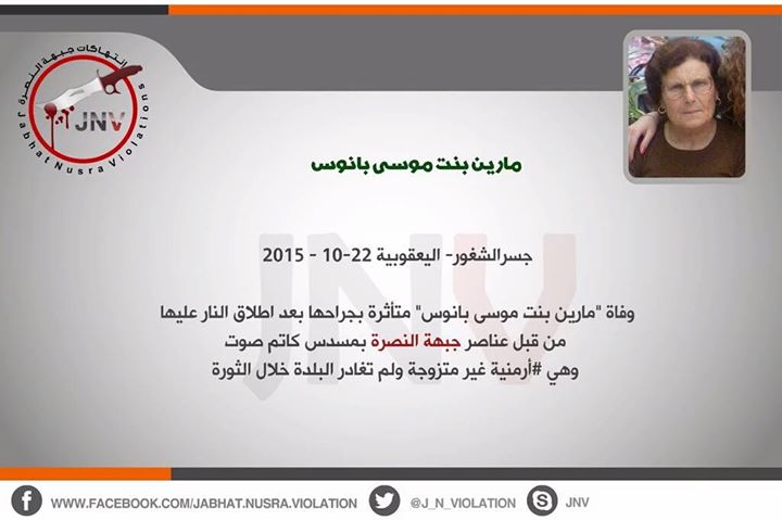 Από μέσο που παρακολουθεί τα εγκλήματα και τις ακρότητες που διαπράτει το Μέτωπο της Νίκης η jabhat al Nusra το συριακό παρακλάδι της αλ Κάιντα ανακοινώνεται ο θάνατος μιας σύριας χριστιανής αρμενικής καταγωγής της Μαρίας Πάνος όνομα πατρός Μωυσής που υπέκυψε στις πληγές των τραυμάτων της.Μέλη της ισλαμιστικής οργάνωσης πυροβόλησαν με πιστόλι εξοπλισμένο με σιγαστήρα την άτυχη γυναίκα προφανώς για σεχταριστικούς λόγους και εμφανέστατα επειδή ήταν χριστιανή.