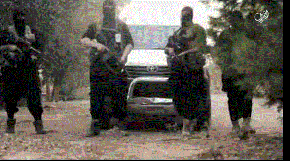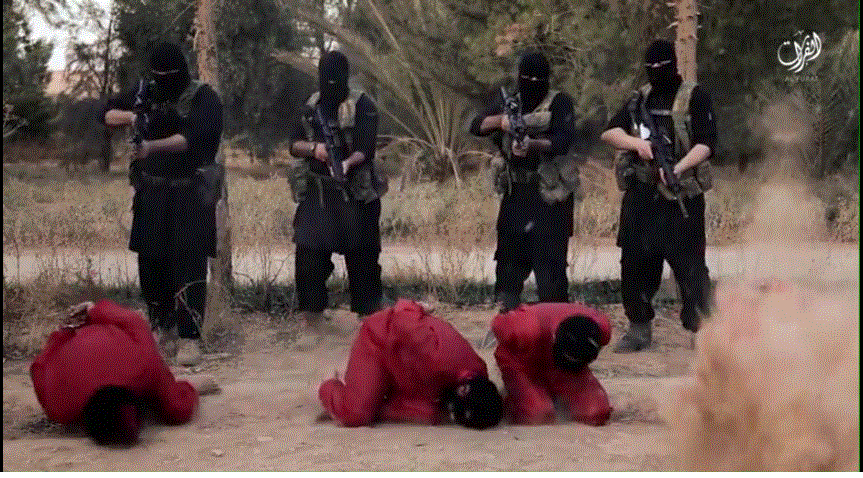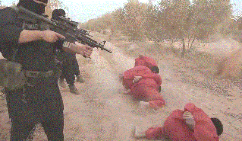 Χθες αναρτήθηκε και νέο βίντεο ομαδικής εκτέλεσης καρατουμένων από το Ισλαμικό Κράτος στο Ιράκ.Τα μέλη του εκτελεστικού αποσπάσματος καταφθάνουν στον τόπο θυσίας προκλητικότατα μ΄ ένα υπερσύγχρονο ΤΟΥΟΤΑ.Στη συνέχεια λαμβάνουν θέσεις και εκτελούν με αυτόματα όπλα εξ επαφής σε συγχρονισμό 4 άτομα που φέρουν πορτοκαλί φόρμες.Οι δήμιοι είναι κουκουλοφόροι και ντυμένοι στα μαύρα.Τα θύματα έχουν μπανατρισμένα τα μάτια δεμένα πισθάγκωνα τα χέρια και είναι καθηλωμένα στα γόνατα.Η εκτέλεση πραγματοποιείται στην ύπαιθρο.