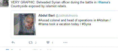 Πολλά φιλοτζιχαντιστικά μέσα πόσταραν τη φωτογραφία του αξιωματικού του συριακού στρατού που εκτελέστηκε γιατί ήταν ο διοικητής του κυβερνείου της πόλης της περιχοής της Χάμα όπως διατείνονται οι εκτελεστές του.Οι δήμιοι και αποκεφαλιστές του χριστιανού υψηλόβαθμου κατά τα φαινόμενα αξιωματικού του συριακού στρατού ήταν μέλη της ψευδομετριοπαθούς οργάνωσης που δραστηριοποιεπίται στην επαρχία του Idlib της « Ajnad Al-Sham » (« Στρατιώτες του Λεβάντε »).Πολλά μηνύματα στο Facebook και στο Twitter που προέρχονται από λογαριασμούς της συριακής αντιπολίτευσης επιχαίρουν με τον αποκεφαλισμό του χριστιανού αξιωματικού.