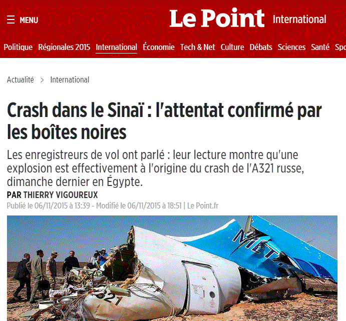 Σε αποκλειστικότητα προφανώς το γαλλικό Le Point μεταδίδει:Tα μαύρα κουτιά μίλησαν: η ανάγνωση των καταγραφών της πτήσης δείχνει ότι μια έκρηξη κατά την πτήση είναι η αιτία της πτώσης και της συντριβής του ρωσικού A321 στο Σινά.