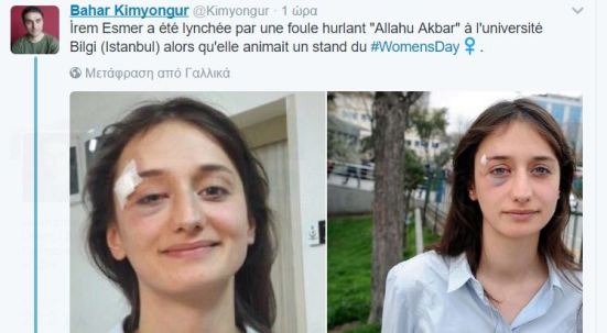 Η İrem Esmer λιντσαρίστηκε στην Τουρκία από ένα πλήθος που ούρλιαζε “Allahu Akbar” στο πανεπιστήμιο Bilgi (στην Κωνσταντινούπολη) καθώς συμμετείχε σ΄ένα κιόσκι για την Παγκόσμια Ημέρα της Γυναίκας αναφέρει ο βέλγος ιστορικός κι ακτιβιστής με καταγωγή από την Τουρκία ο Βahar Kimyongur.