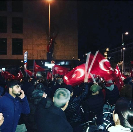 Κάποιοι διαδηλωτές κάνουν το σήμα των γκρίζων λύκων, άλλοι των αδερφών μουσουλμάνων.Σύμφωνα με το διαδίκτυο και τα βίντεο οι διαδηλωτές φωνάζουν Αλλάχ Ακμπάρ και Ερντογάν.