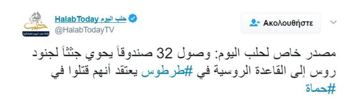 Το μέσο της λεγόμενης αντιπολίτευσης Ηalab Today αναφέρει πριν λίγο επικαλούμενο εξειδικευμένη πηγή από το Χαλέπι σήμερα ότι αφίχθησαν στη ρωσική βάση στην Ταρτούς 32 φέρετρα που περιείχαν σωρούς ρώσους στρατιωτών που σκοτώθηκαν στην περιοχή της Hama.