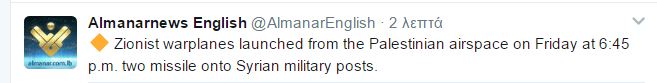”Iσραηλινά αεροσκάφη εξαπέλυσαν από τον εναέριο χώρο της Παλαιστίνης 2 πυραύλους κατά θέσεων του συριακού στρατού την Παρασκευή στις 6:45 p.m.” αναφέρει πριν από λίγο το λιβανέζικο al manar.