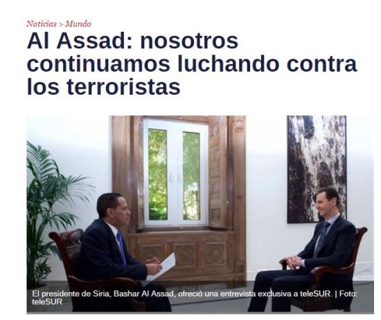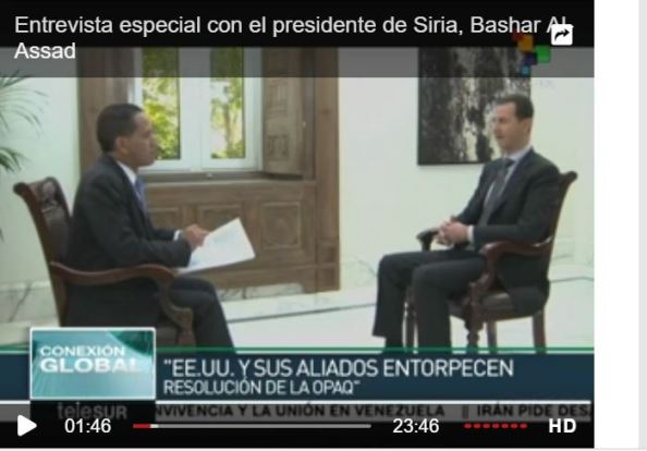O πρόεδρος Bachar al-Assad σε συνέντευξή του στην τηλεόραση της Βενεζουέλας “Telesur”, ανέφερε ότι “ο σκοπός όλων των αμερικανικών και δυτικών ισχυρισμών για χημικά όπλα είναι για να υποστηρίξουν τους τρομοκράτες στη Συρία ”.”Οι ΗΠΑ έκαναν θεατρικό κομμάτι ”κατασκευάζοντας” τη χρήση χημικών όπλων σε μια άλλη ζώνη στη Συρία για να επωφεληθούν σε αυτό το πλαίσο με σκοπό να παρέμβουν στρατιωτικά για να υποστηρίξουν τους τρομοκράτες ” είπε.Εμείς συνεχίζουμε τη μάχη κατά της τρομοκρατίας τόνισε.