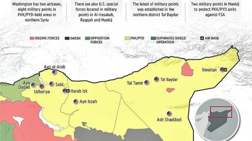 Σύμφωνα με το τουρκικό ειδησεογραφικό οι ΗΠΑ διαθέτουν πολυάριθμες στρατιωτικές βάσεις επί συριακού εδάφους.Έτσι 2 αεροπορικές βάσεις τέθηκαν σε λειτουργία, η μια τον Οκτώβρη του 2015 στην περιοχή της Rmeilan στα ΝΔ της επαρχίας Hassaké και άλλη μια στην ίδια επαρχία στη ΒΑ Συρία. Μια ακόμη βάση άνοιξε στην περιοχή Harab Isk στα ΝΔ της πόλης Kobané στην επαρχία Χαλεπίου, στη Β Συρία και θα διαθέτει ελικόπτερα.Αυτή η βάση θα χρησιμεύσει ομοίως ως σημείο μεταφόρτωσης σ΄έναν από τους διαδρόμους παράδοσης στρατιωτικής βοήθειας στους συροκούρδους.